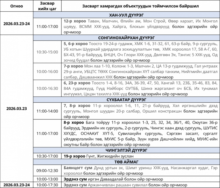 Өнөөдөр буюу 2026 оны гуравдугаар сарын 23-ны Даваа гарагт цахилгаан шугам сүлжээнд хийх засварын хуваарийг танилцуулж байна.