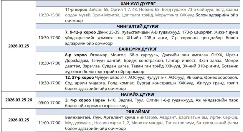 Өнөөдөр буюу гуравдугаар сарын 25-нд цахилгаан хязгаарлах байршлуудыг танилцуулж байна.