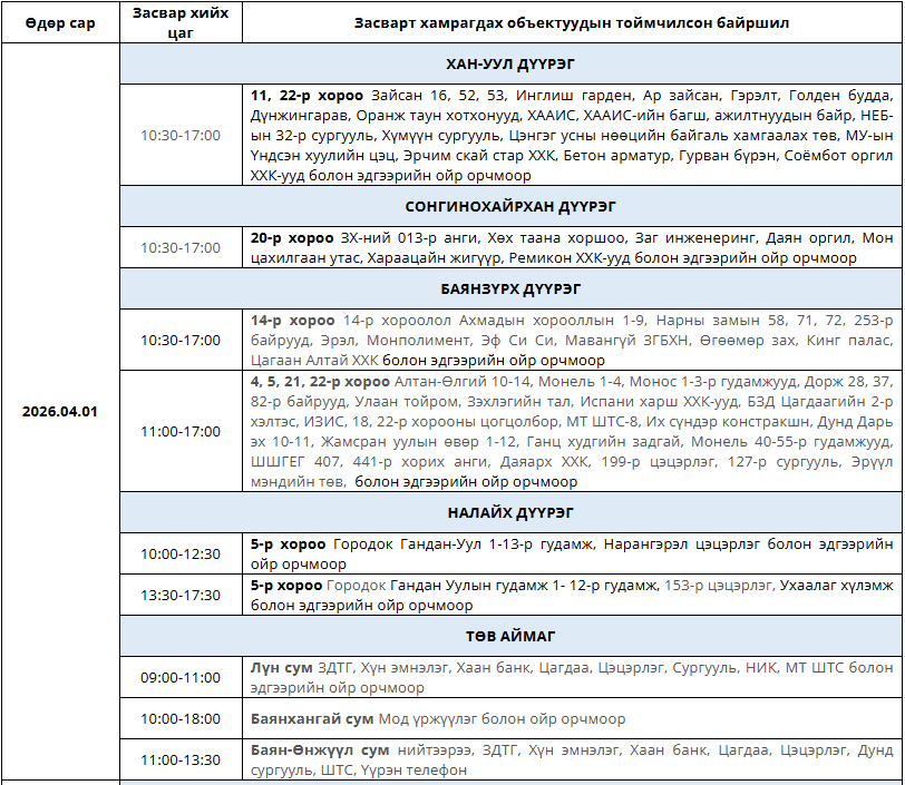 Улаанбаатар Цахилгаан Түгээх Сүлжээ(УБЦТС) ТӨХК 2026 оны дөрөвдүгээр сарын 1-ний өдөр цахилгаан шугам тоноглолд засвар хийх тоймчилсон байршил, цагийн хуваарийг мэдээллээ.