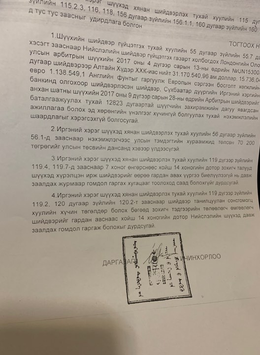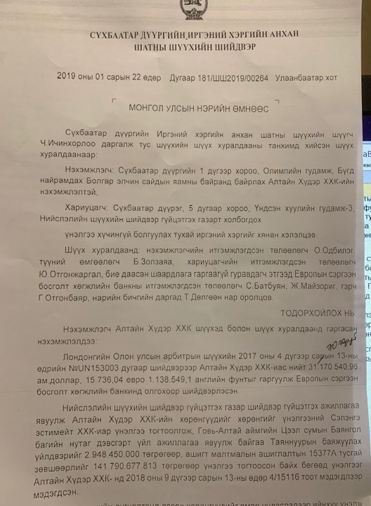 АЛТАЙ ХҮДЭР ХХК АРБИТРТ УНАЖ ТАЯН НУУРЫН УУРХАЙГ АЛДАХАД ХҮРЧЭЭ