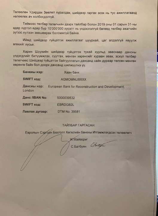 Алтай хүдэр ХХК-ийн зүгээс өдрийн 2019 оны нэгдүгээр сарын 31-ыг хүртэл өдөр бүр 10,000,000 сая төгрөгөөр төлж барагдуулах хүсэлтийг гаргасан ч, саналыг "Европын сэргээн босголын хөгжлийн банк хүлээн зөвшөөрөх боломжгүй гэжээ.