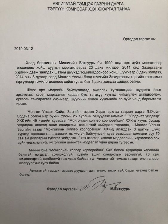 Үүнтэй холбогдуулан Дээд шүүхийн захиргааны хэргийн танхимын тэргүүн М.Батсуурь АТГ-т хандлаа. Тэрбээр ЗГХЭГ-ын дарга Л.Оюун-Эрдэнэ өөрийг нь гүтгэсэн хэмээн үзэж, Монголын зэс корпораци ХХК болон Худалдаа хөгжлийн банктай холбоотой эсэхээ шалгуулахаар АТГ-т өргөдөл гаргалаа.
