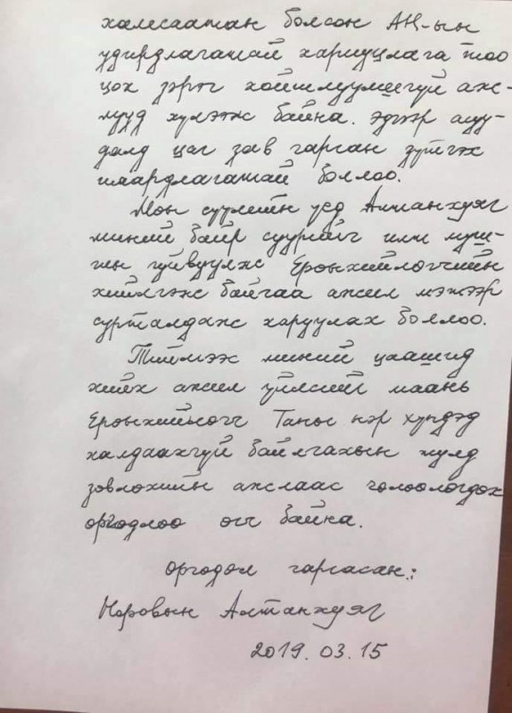 Монгол улсын ерөнхийлөгчийн зөвлөхөөр ажиллаж байсан Норовын Алтанхуяг ажлаасаа чөлөөлөгдөх өргөдлөө өгсөн байна. Тэрээр 2017 оны ерөнхийлөгчийн сонгуулийн дараачаас Х.Баттулгын зөвлөхөөр ажиллаж байсан юм. Өргөдөлдөө шударга ёсны төлөө тэмцсээр ирснийг дурьдаад цаашид ардчиллаа аврах, хүний эрхийг хамгаалах, нам дамнасан бүлэглэлийн хамсаатан болсон АН-ын удирдлагатай хариуцлага тооцох зэрэгт цаг зав гаргах шаардлагатай байна гэжээ.