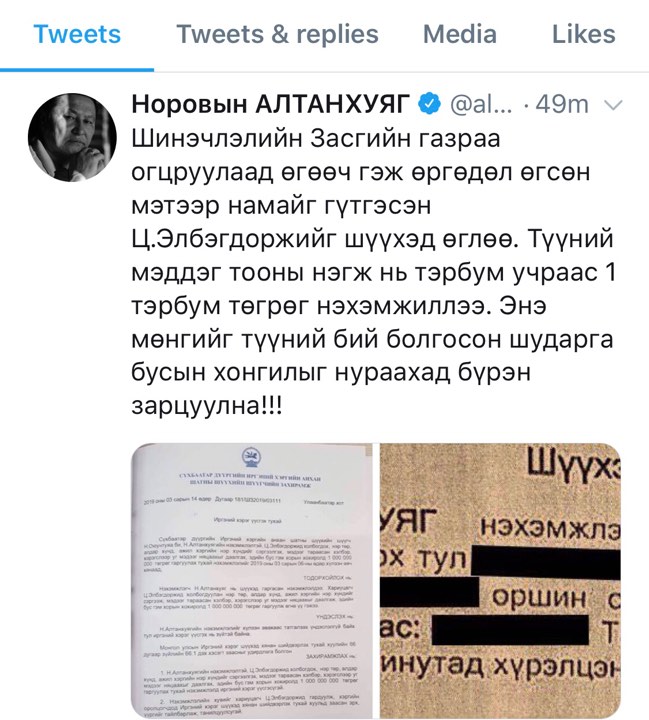 Ерөнхий сайд асан Н.Алтанхуяг экс Ерөнхийлөгч Ц.Элбэгдоржийг шүүхэд өгч, нэг тэрбум төгрөг нэхэмжиллээ. Тэрбээр энэ тухайгаа "Шинэчлэлийн Засгийн газраа огцруулаад өгөөч гэж өргөдөл өгсөн мэтээр намайг гүтгэсэн Ц.Элбэгдоржийг шүүхэд өглөө. Түүний мэддэг тооны нэгж нь тэрбум учраас 1 тэрбум төгрөг нэхэмжиллээ. Энэ мөнгийг түүний бий болгосон шударга бусын хонгилыг нураахад бүрэн зарцуулна!!!" хэмээн цахим хуудсанаа бичжээ.