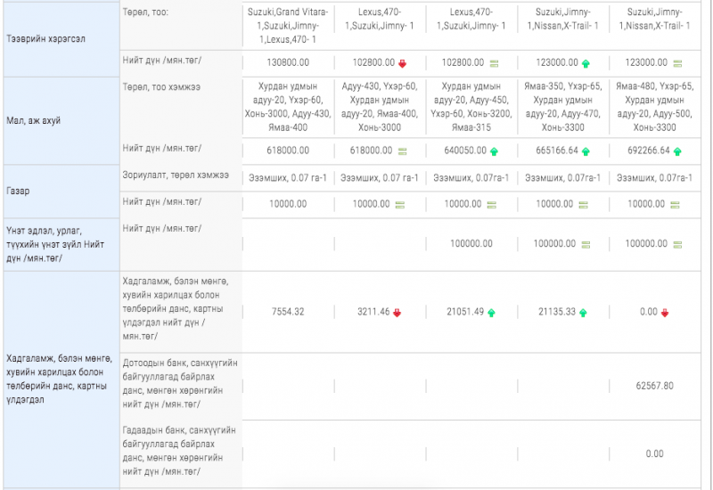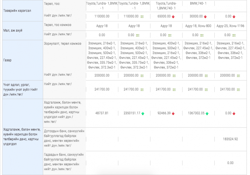 Тэрбээр 929 сая төгрөгөөр тоологдох нийтийн нэг үйлчилгээний 2 орон сууц барилга байгууламжтай.Таван компанид хувьцаа эзэмшиж хувь авдаг гэж мэдүүлжээ.Түүний нэр ЖДҮХС-аас зээл авсан 49 гишүүний нэг.