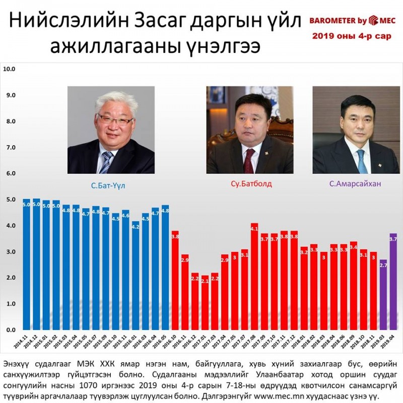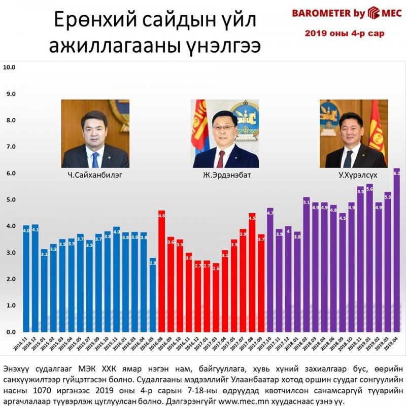 МЭК судалгааны байгууллагаас сар бүр улстөрийн барометр судалгааг танилцуулдаг. Тэгвэл 4-р сарын судалгааг Ерөнхийлөгч Х.Баттулга, Ерөнхий сайд У.Хүрэлсүх, хотын дарга С.Амарсайхан нар албан тушаал бүрдээ тэргүүлсэн байна. Өөрөөр хэлбэл судалгаанд оролцогчдоос өндөр үнэлгээг авчээ.