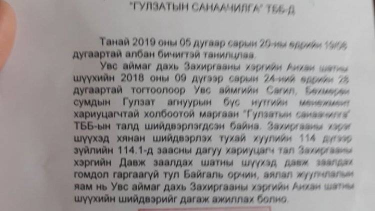 Өнгөрсөн амратын өдрүүдээр Улаанбаатарт аргаль угалзын толгойнууд авчран эсэргүүцлээ илэрхийлж байгаа Увс аймгийн малчдын асуудалд БОАЖЯ-наас албан бичиг хүргүүлжээ. Ингэхдээ салбар яамны зүгээс шүүхийн шийдвэрийг дагаж ажиллахаа мэдэгдсэн байна.