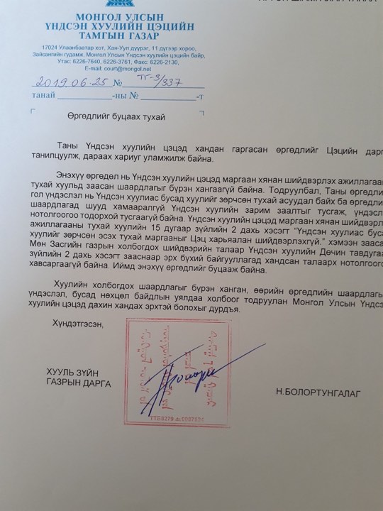 Тэгвэл өнөөдөр хариу шийдвэр гарч, өргөдлийг буцаажээ. Шалтгаан нь, үндсэн хуулийн цэцэд маргаан хянан шийдвэрлэх ажиллагааны тухай хуульд заасан шаардлагыг бүрэн хангаагүй байна гэж үзэн, өргөдлийг буцаасан байна.