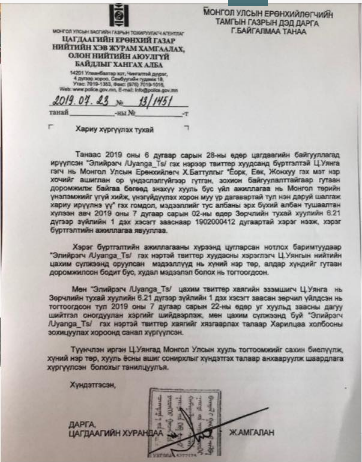 Уг асуудлаар ЦЕГ-аас Ерөнхийлөгчийн тамгын газарт хүргүүлсэн албан бичигт иргэн Ц.Уянгын твиттер хаягийг хязгаарлах хүсэлтээ Харилцаа холбооны зохицуулах газарт гаргасан гэдгийг дурдсан байна.