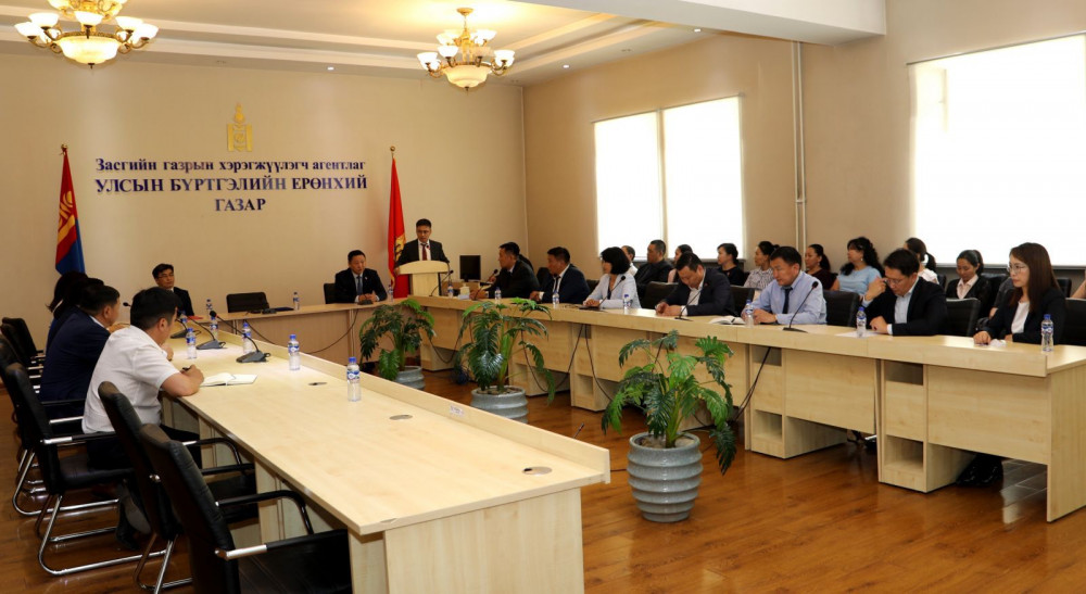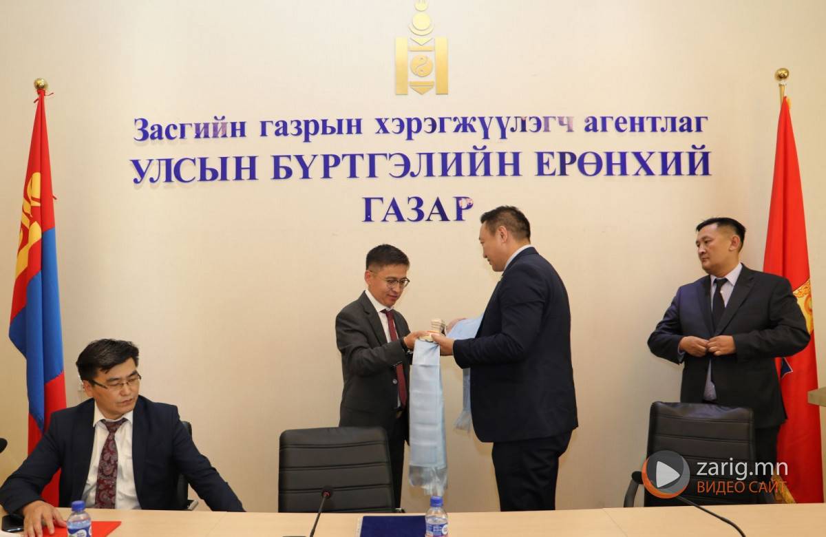 Засгийн газрын тогтоолыг ЗГХЭГ-ын Хууль эрх зүйн газрын дарга Н.Мягмар танилцуулж, улсын бүртгэлийн байгууллагын тамгыг Хууль зүй, дотоод хэргийн яамны Төрийн нарийн бичгийн дарга Б.Баасандорж гардуулан өгч, ажлын амжилт хүслээ.