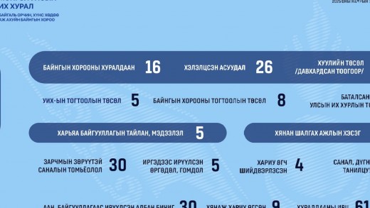 Тус Байнгын хороо Монгол Улсын хууль, Улсын Их Хурлын бусад шийдвэрийн төслийг чуулганы нэгдсэн хуралдаанаар хэлэлцүүлэн батлуулсан байна. Тухайлбал, Засгийн газраас 2025 оны 01 дүгээр сарын…